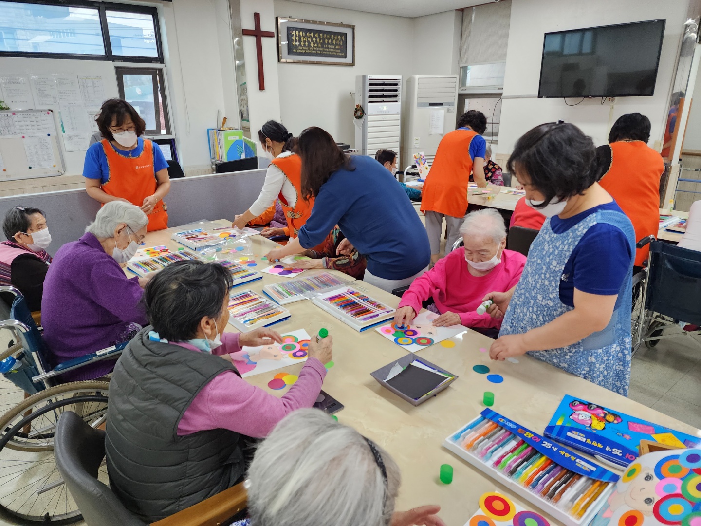 음악에 맞추어 체조를 하고 주제에 맞는 이야기를 하고 다양한 재료를 가지고 다양하게 표현되는 결과물에 환한 미소로 화답 해 주시는 어르신들~~