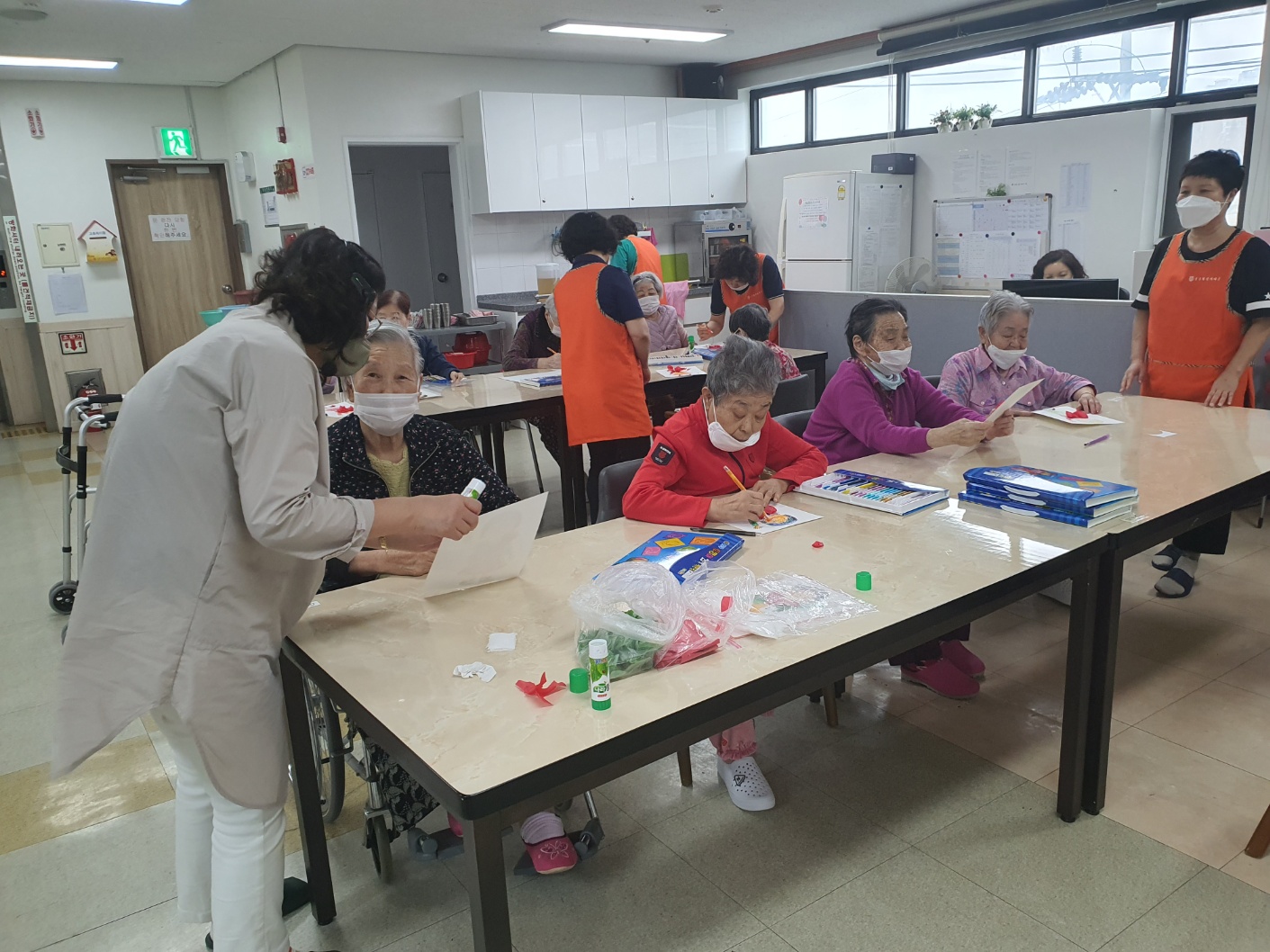반가운 인사와 인지에 도움 드릴 수 있는 이야기를 주고 받고 음악에 맞추어 율동을 하고 집중하고 미리 준비한 미술재료로 만들고 오리고 짜자잔~~ 완성!!!