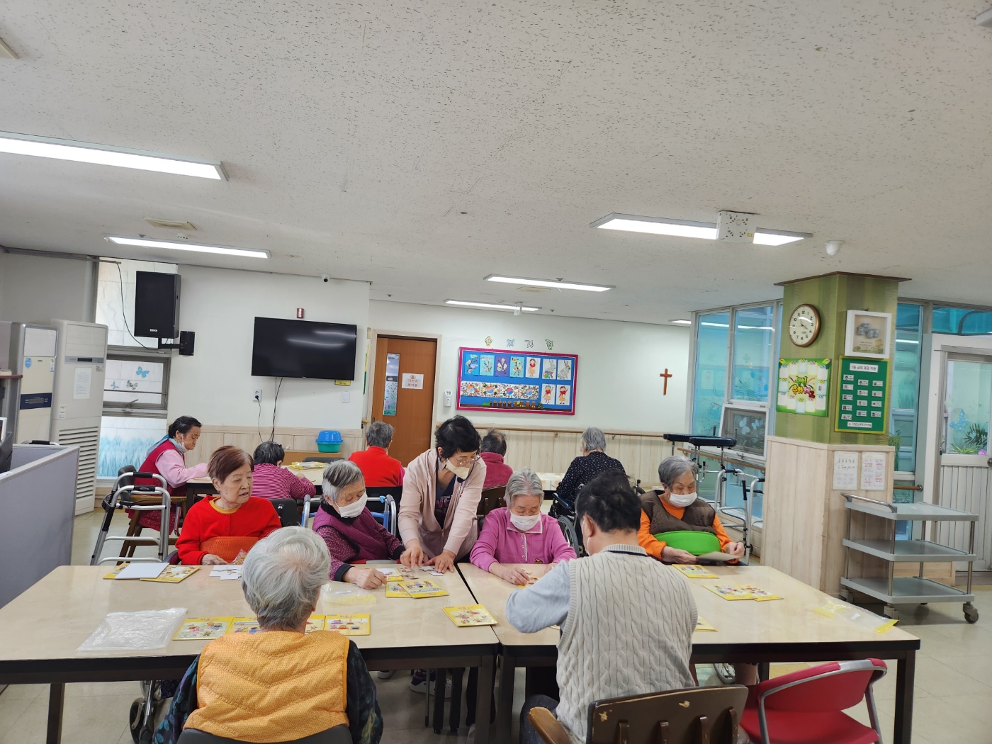 신나는 음악과 구령에 맞추어 운동도 하고 다양한 블럭으로 기능 유지에 도움을 드리는 여가 프로그램인 운동치료~~ 어르신들이 참 좋아하신답니다!!!