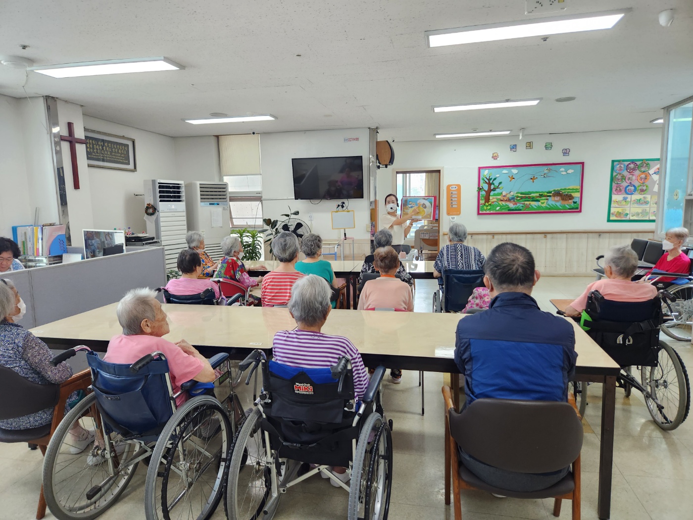 다양한 주제와 이야기를 준비하여 책도 읽어 드리고 회상과 인지에 도움 드리는 여가프로그램이랍니다. 개별프로그램(생활실로 찾아가 말 벗과 음악을 들려드림.)과 집단프로그램(외부강사가 진행)을 병행하여 진행하고 있답니다.