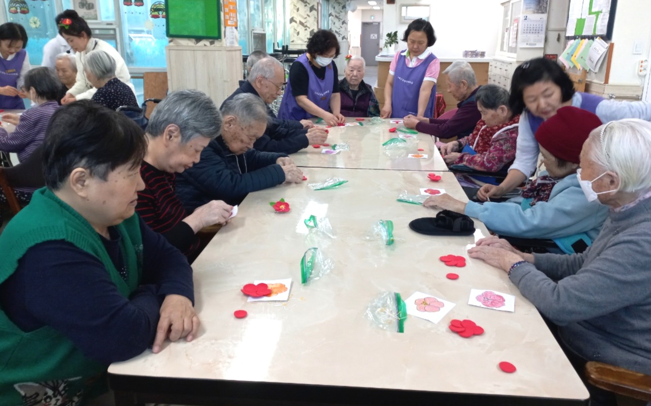동백아가씨 노래를 들으며 클레이를 이용하여 동백꽃을 만들고 브로치를 만들어 보셨습니다. 꽃잎 한 장 한 장 정성을 대하여 만드셨으며 완성된 동백꽃 브로치를 머리에 꽂으며 좋아하셨습니다.