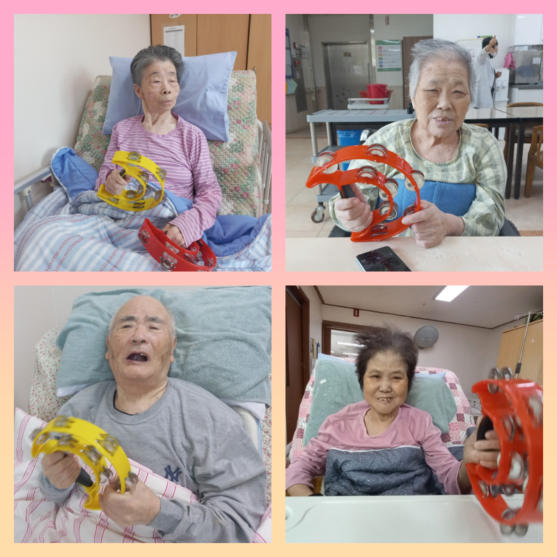 리듬에 맞춰 탬버린을 흔들거나 바닥을 치며 다양하게 소리를 내며 즐거운 시간을 보내셨습니다.