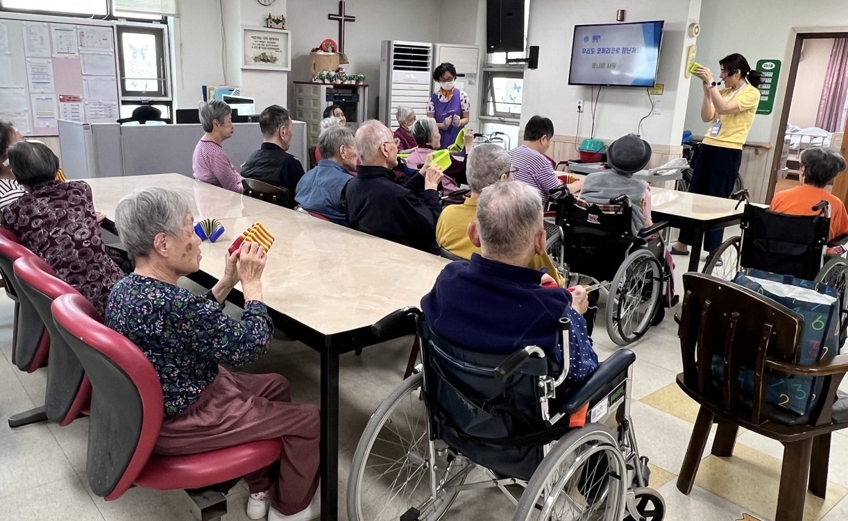 즐거운 음악시간 매주 강사님께서 생소한 악기를 준비해 오십니다. 이번엔 코끼리 코라는 악기를 이용해 프로그램을 진하였는데 악기가 신기하고 단순한 손 놀림으로 소리를 내어 음악과 함께 즐거운 시간을 가졌습니다. 악기가 이름과 같이 코끼리 코처럼 생겨 어르신들께서 재미있으신지 보고 웃으셨습니다.