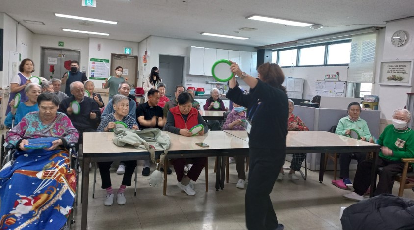 오션드럼을 이용한 음악시간입니다. 흔들어 소리를 내는 악기로 어르신들께서 “파도소리”, “키로 곡식을 흔드는 소리“라고 하셨습니다. 신나는 음악에 맞춰 리듬감 있게 오션드럼을 흔들며 즐거운 시간을 보내셨습니다.