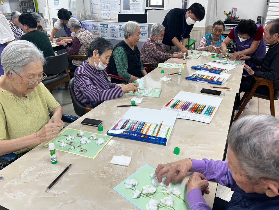 매주 월요일 진행되는 즐거운 미술 프로그램입니다. 이것저것 만들며 완성된 작품을 보고 웃으시며 좋아하셨습니다.