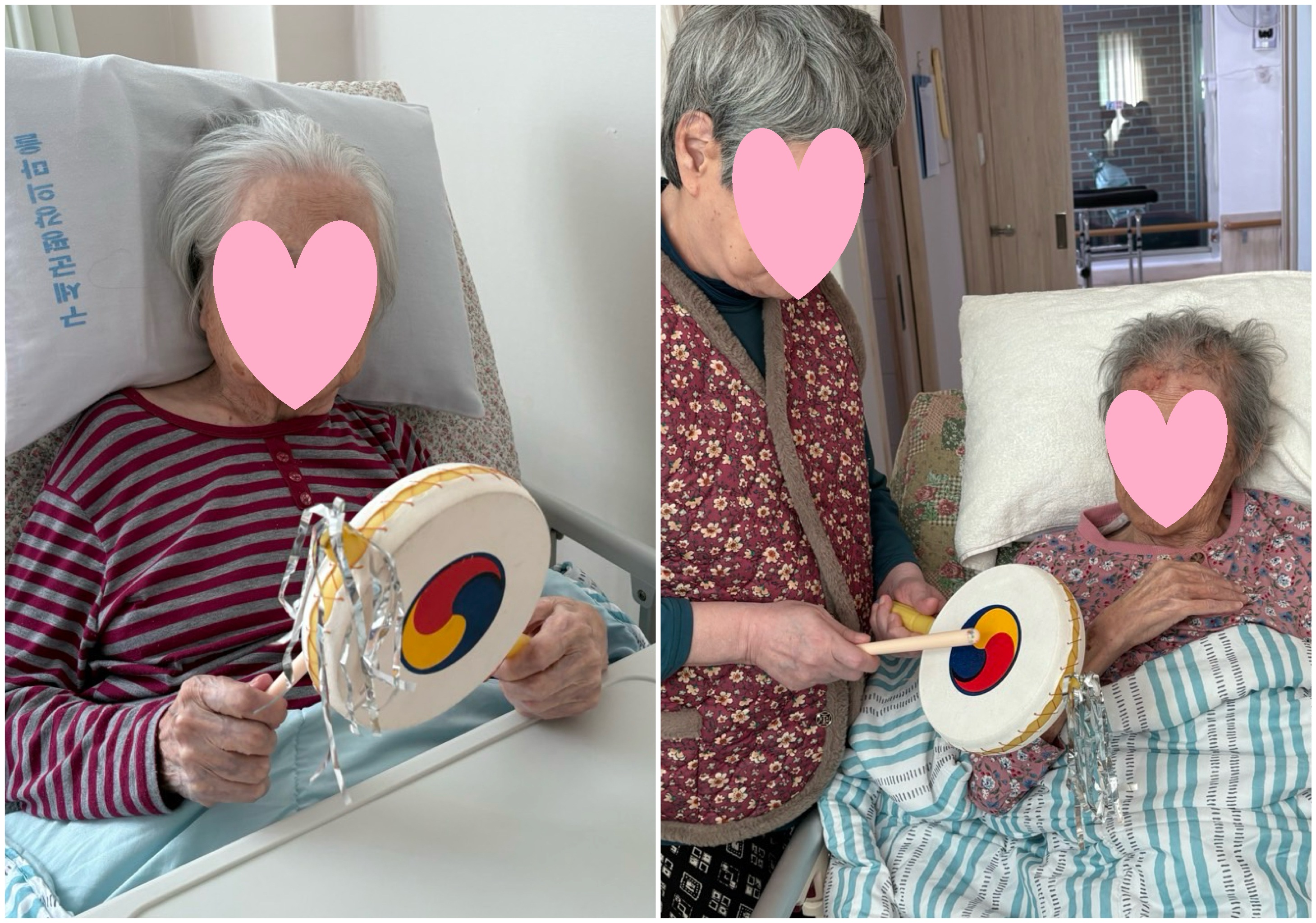 생활실에서 어르신들과 노래를 들으며 소고 활동을 했습니다.