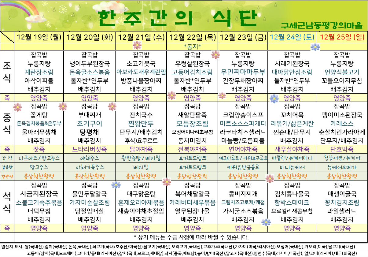 평강가족 > 자유게시판 > 12월 셋째주 식단입니다.