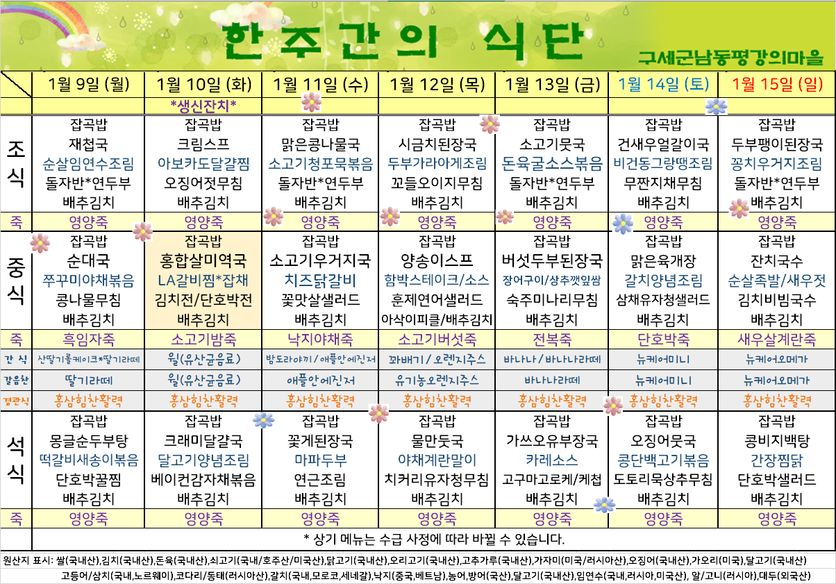 평강가족 > 자유게시판 > 1월 둘째주 식단입니다.