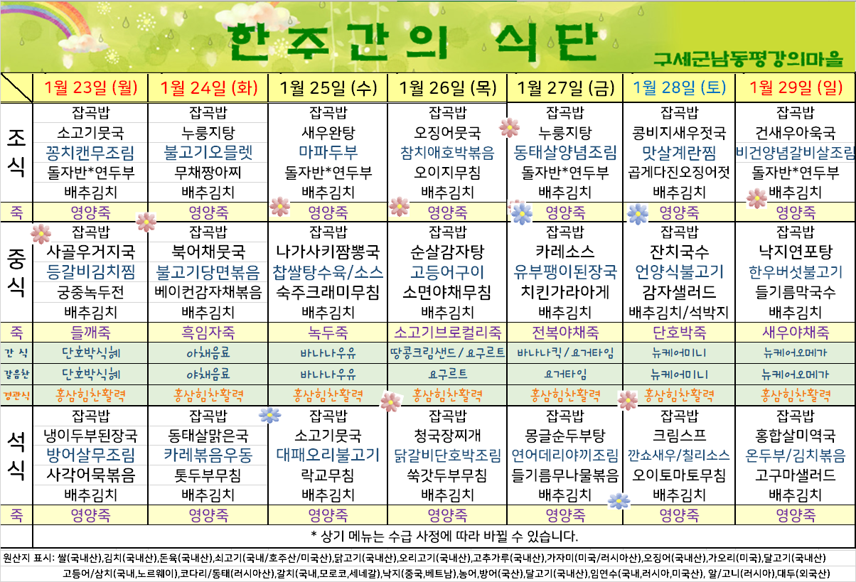 평강가족 > 자유게시판 > 1월 마지막째주 식단입니다.