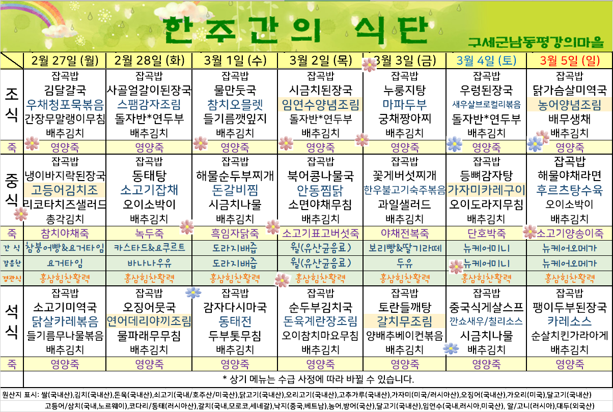 평강가족 > 자유게시판 > 3월 첫째주 식단입니다.