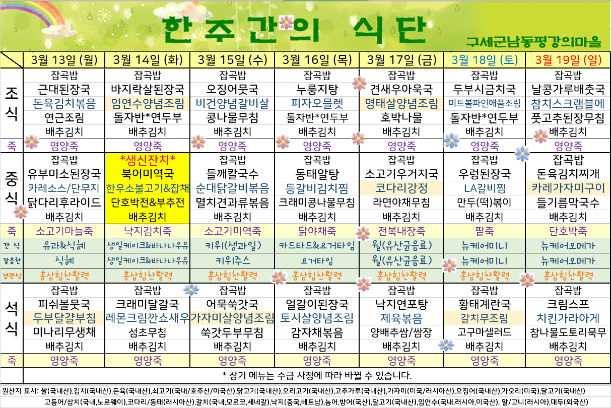 평강가족 > 자유게시판 > 3월 셋째주 식단입니다.