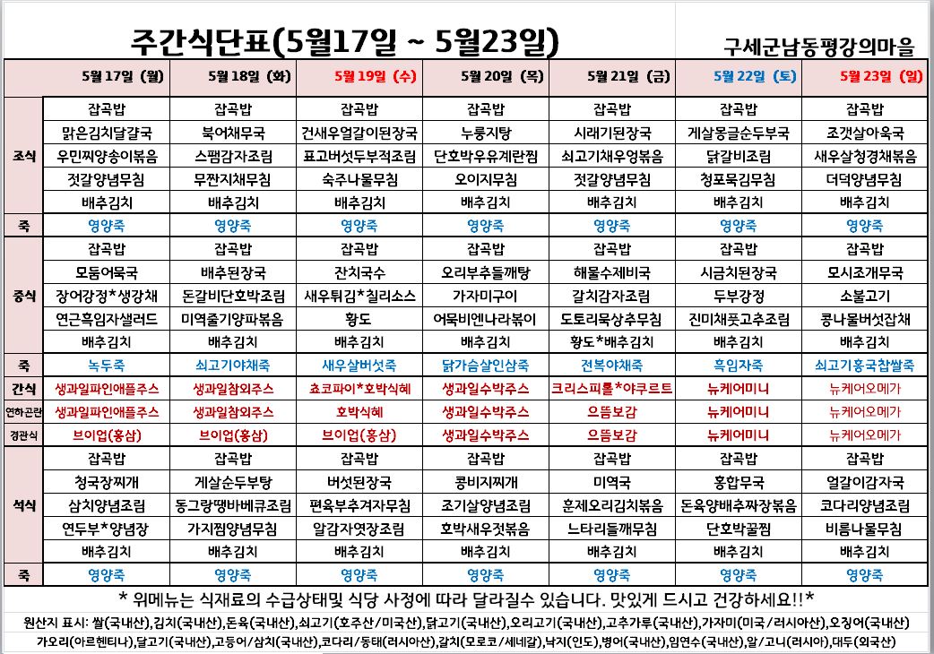 평강가족 > 자유게시판 > 5월 세째주 식단입니다