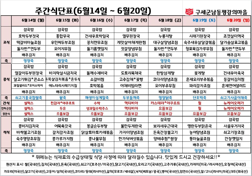 평강가족 > 자유게시판 > 6월 셋째주 식단입니다