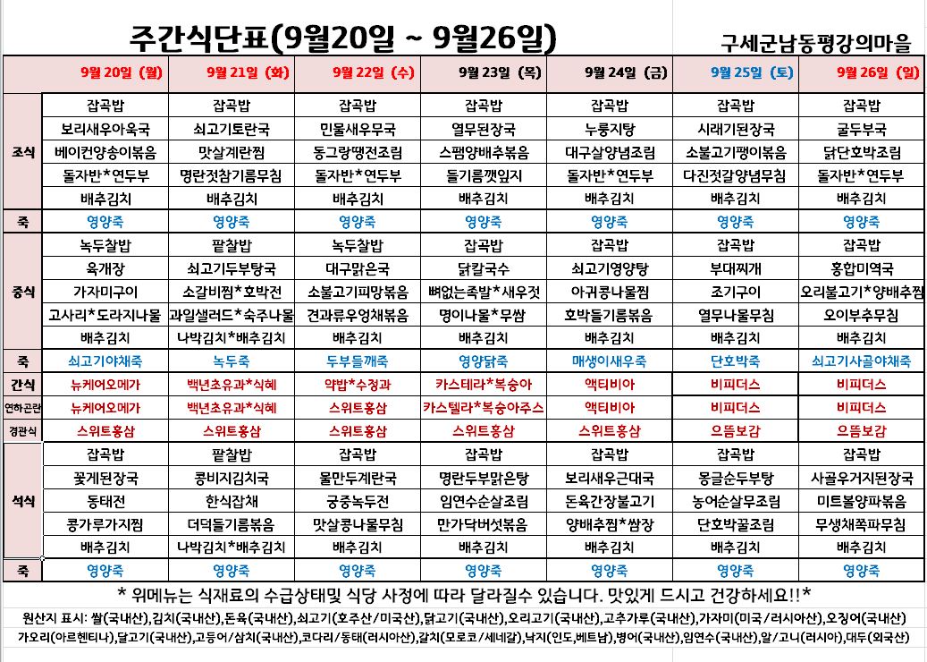 평강가족 > 자유게시판 > 9월 넷째주 식단입니다