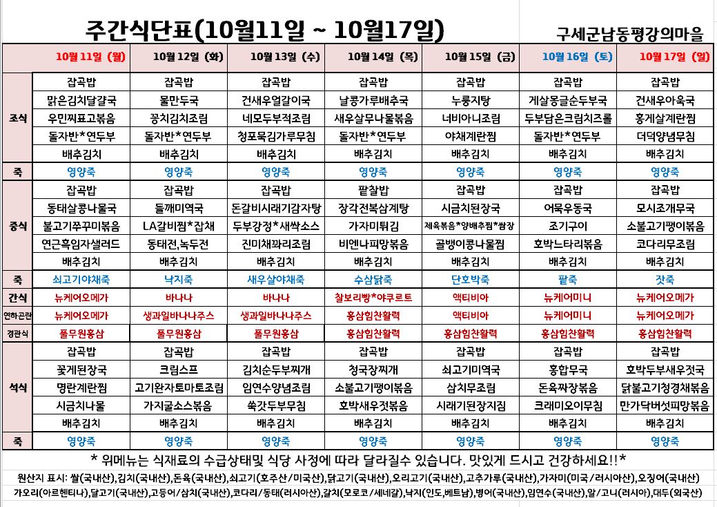평강가족 > 자유게시판 > 10월 셋째주 식단입니다