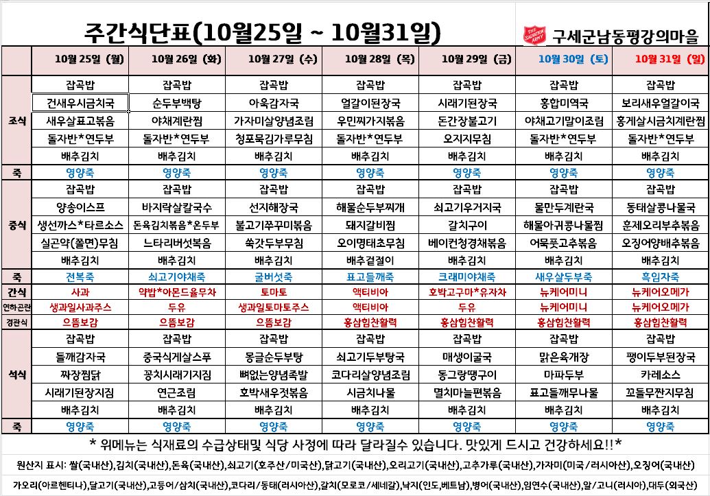 평강가족 > 자유게시판 > 10월 다섯째주 식단입니다