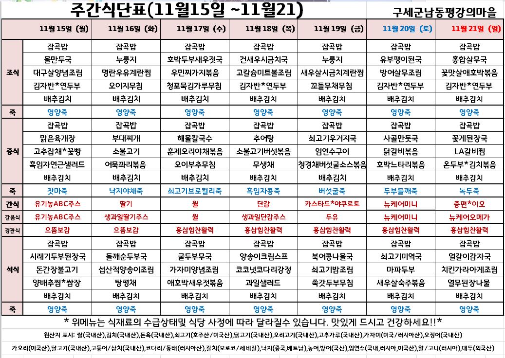 평강가족 > 자유게시판 > 11월 세째주 식단입니다