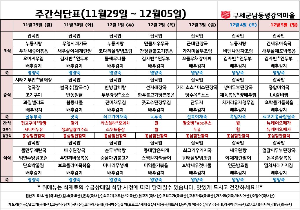 평강가족 > 자유게시판 > 12월 첫째주 식단입니다