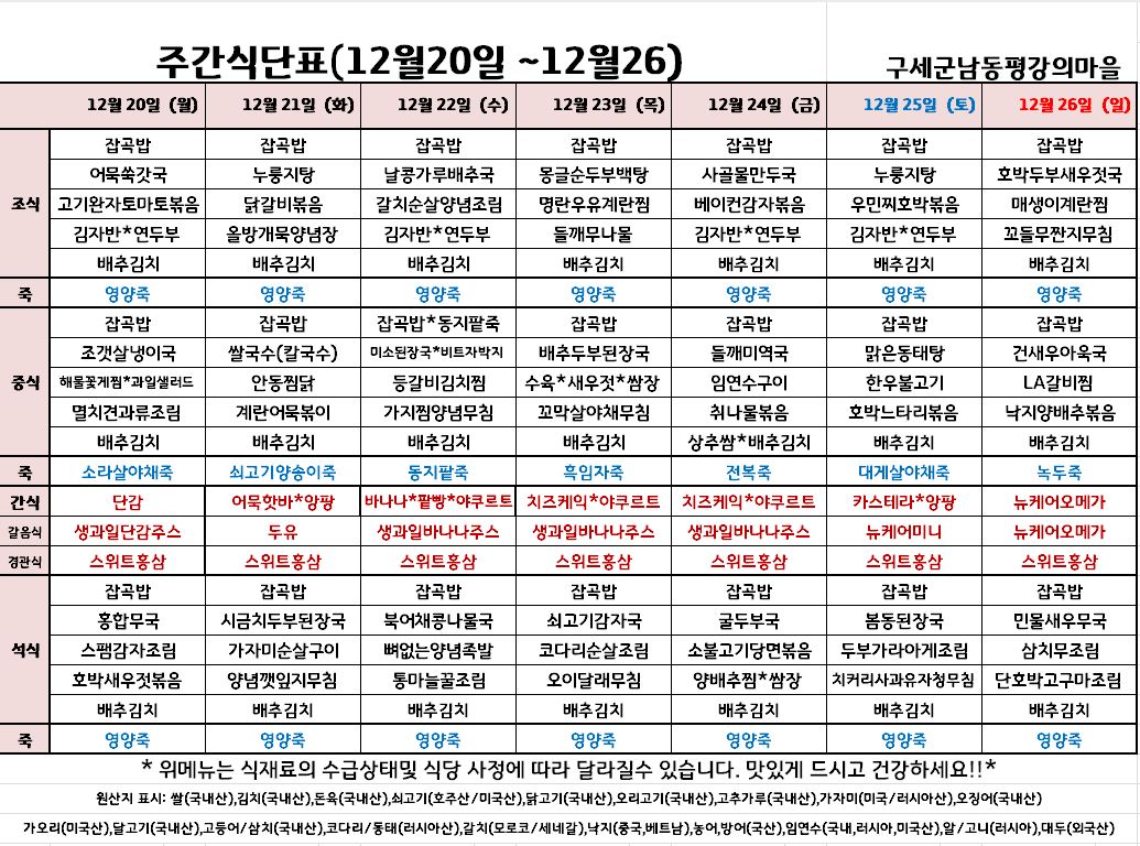 평강가족 > 자유게시판 > 12월 넷째주 식단입니다
