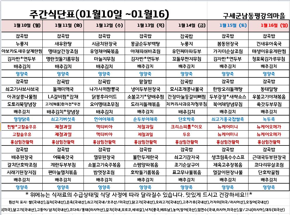 평강가족 > 자유게시판 > 1월 둘째주 식단입니다