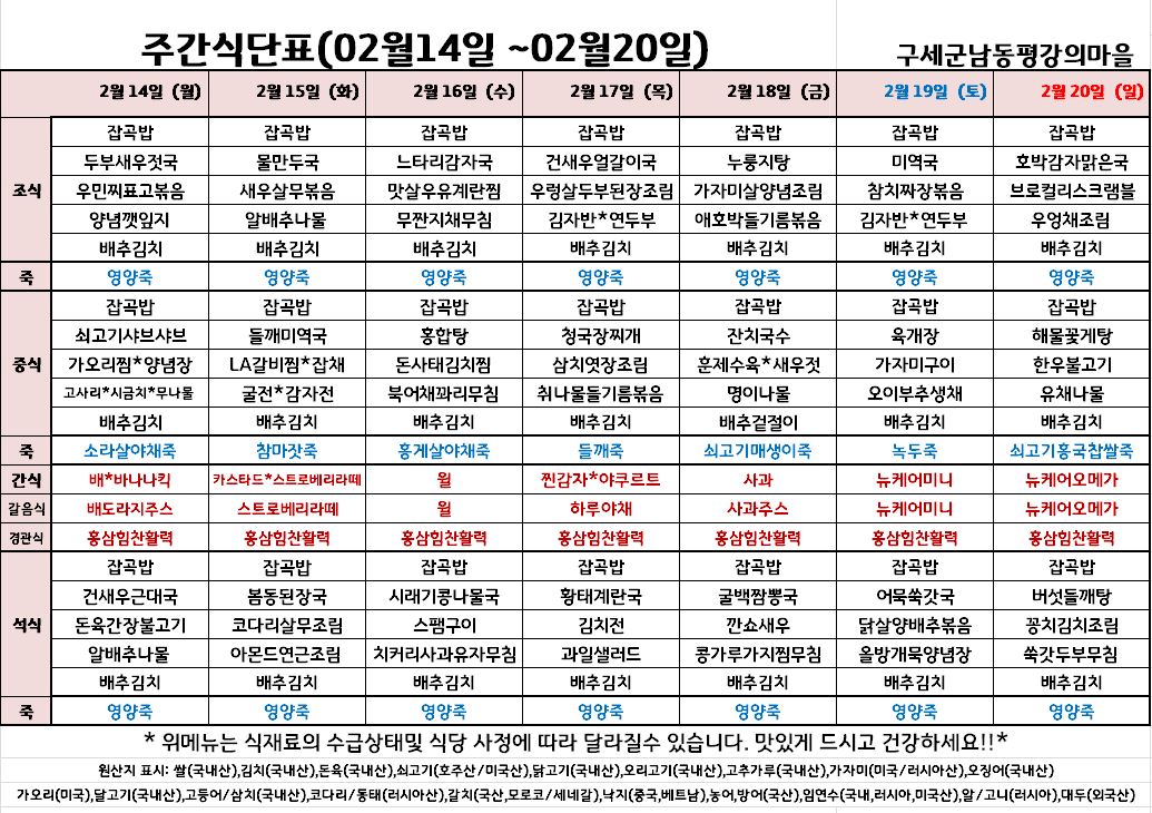 평강가족 > 자유게시판 > 2월 셋째주 식단입니다