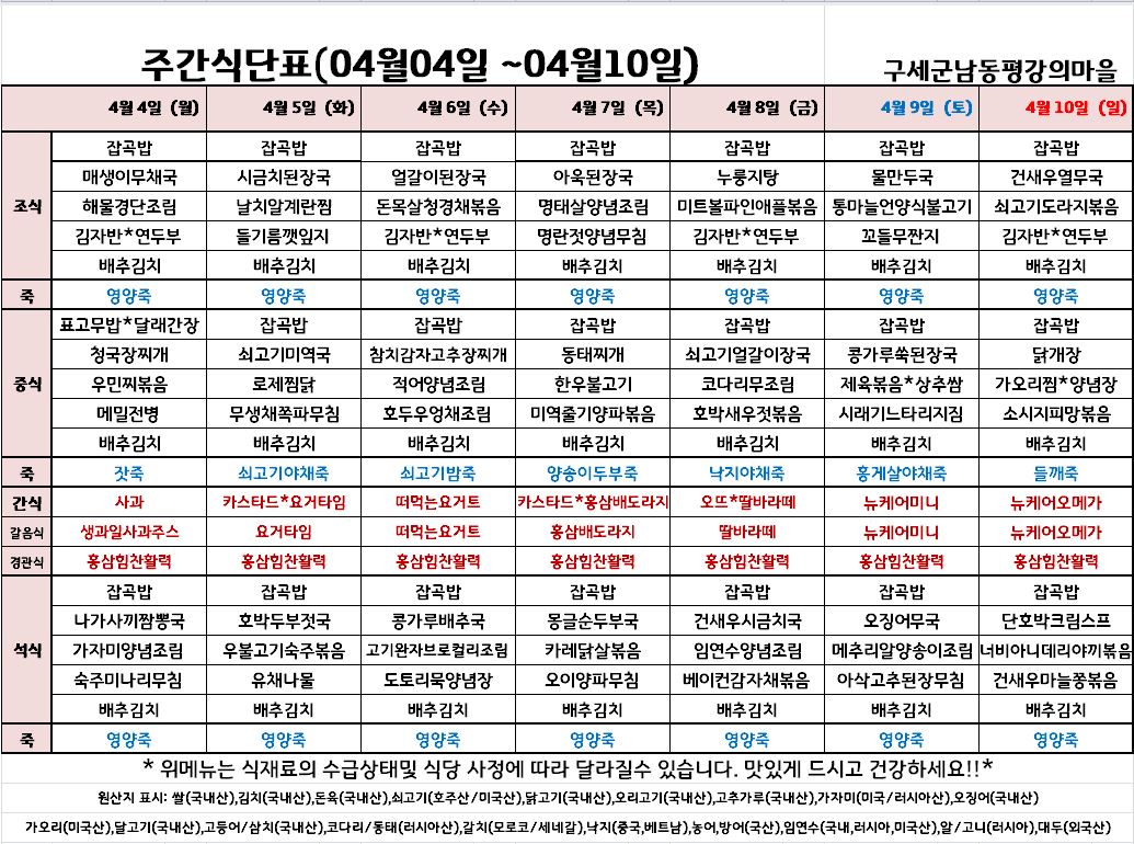 평강가족 > 자유게시판 > 4월 첫째주 식단입니다