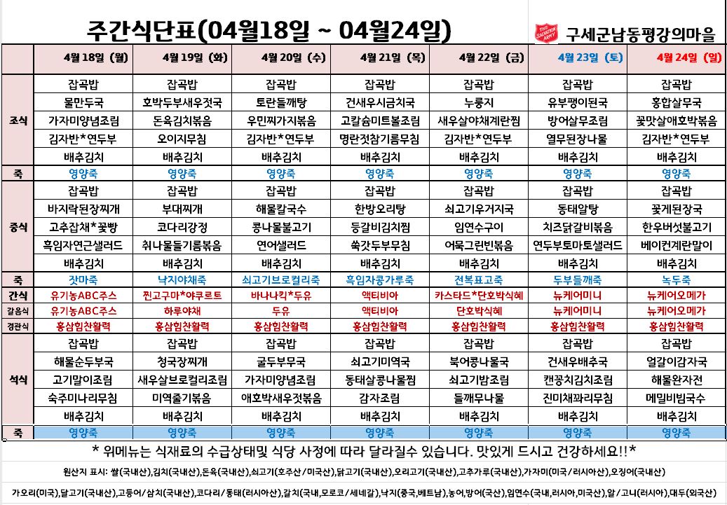 평강가족 > 자유게시판 > 4월 셋째주 식단입니다