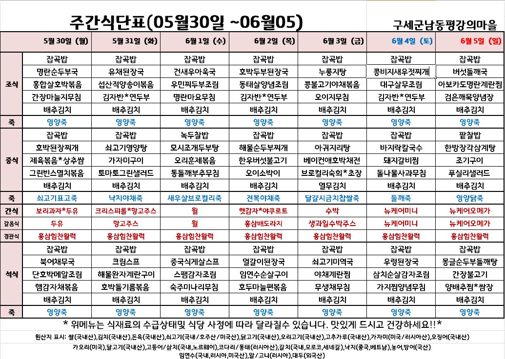 평강가족 > 자유게시판 > 6월 첫째주 식단입니다