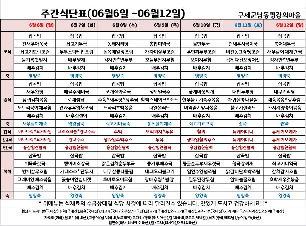 평강가족 > 자유게시판 > 6월 둘째주 식단입니다