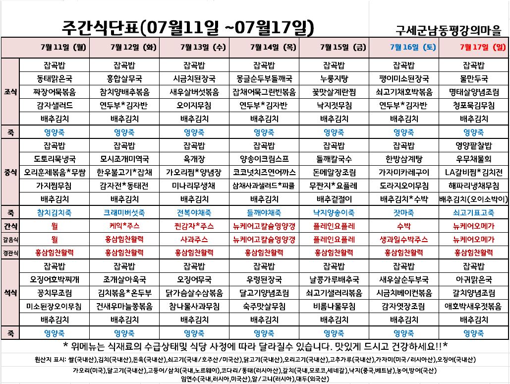 평강가족 > 자유게시판 > 7월 둘째주 식단입니다