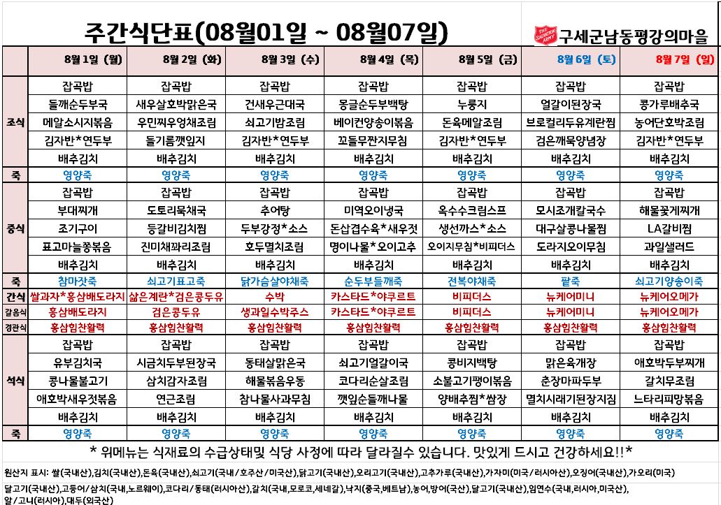 평강가족 > 자유게시판 > 8월 첫째주 식단입니다
