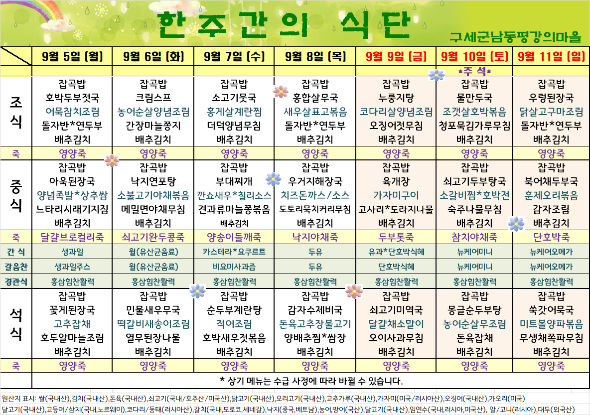 평강가족 > 자유게시판 > 9월 첫째주 식단입니다.