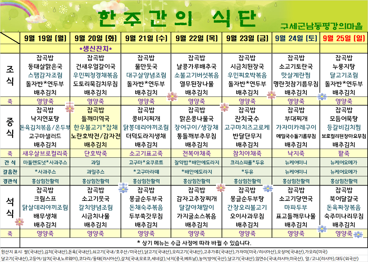 평강가족 > 자유게시판 > 9월 셋째주 식단입니다.