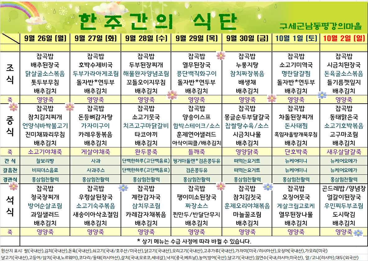평강가족 > 자유게시판 > 9월 마지막째주 식단입니다.