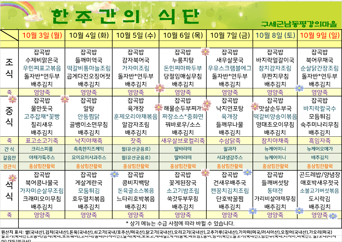 평강가족 > 자유게시판 > 10월 첫째주 식단입니다.