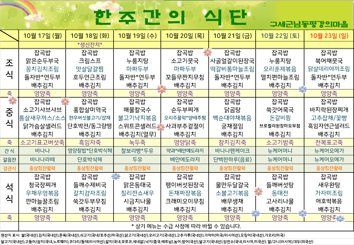 평강가족 > 자유게시판 > 10월 셋째주 식단입니다.