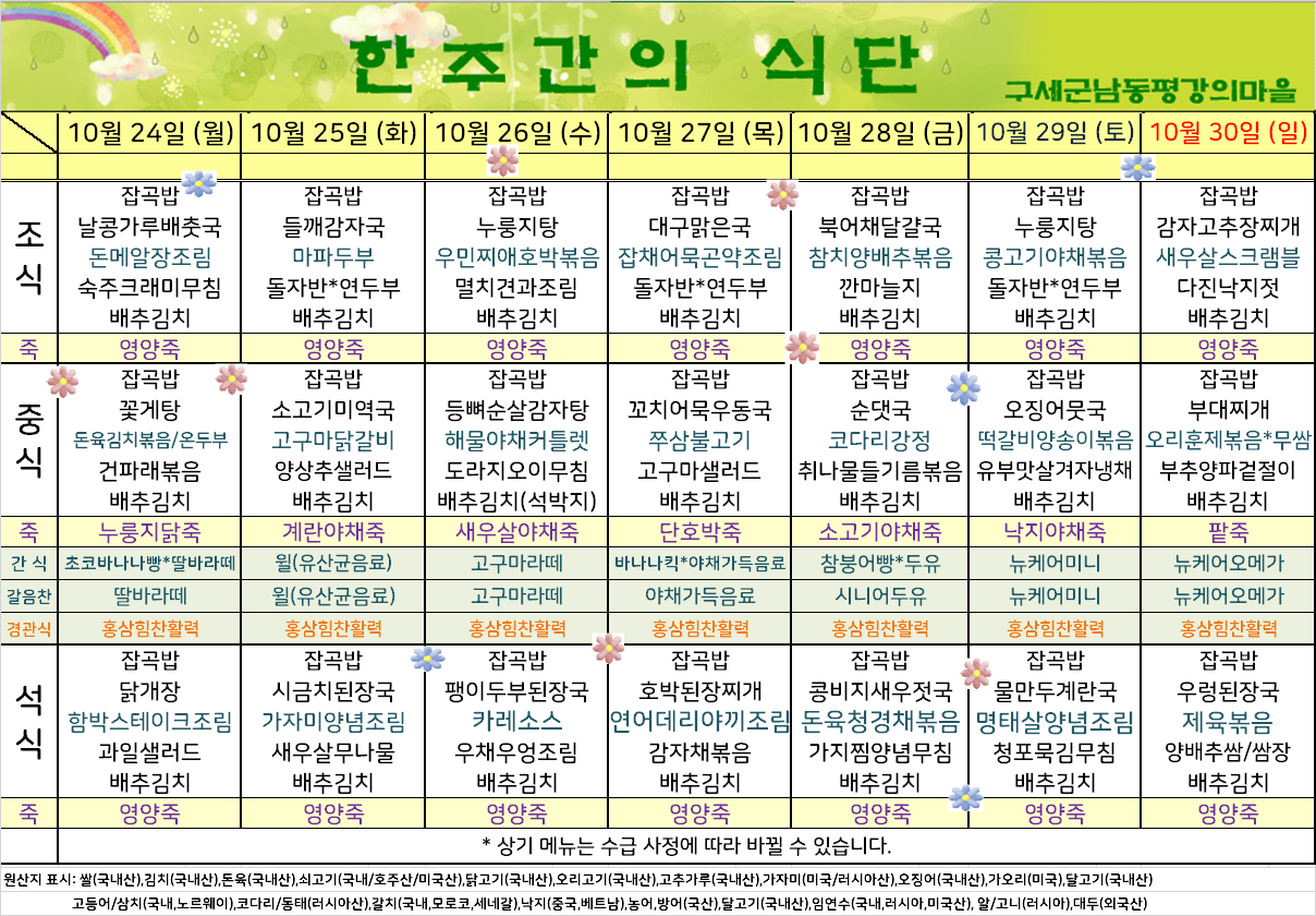 평강가족 > 자유게시판 > 10월 마지막째주 식단입니다.
