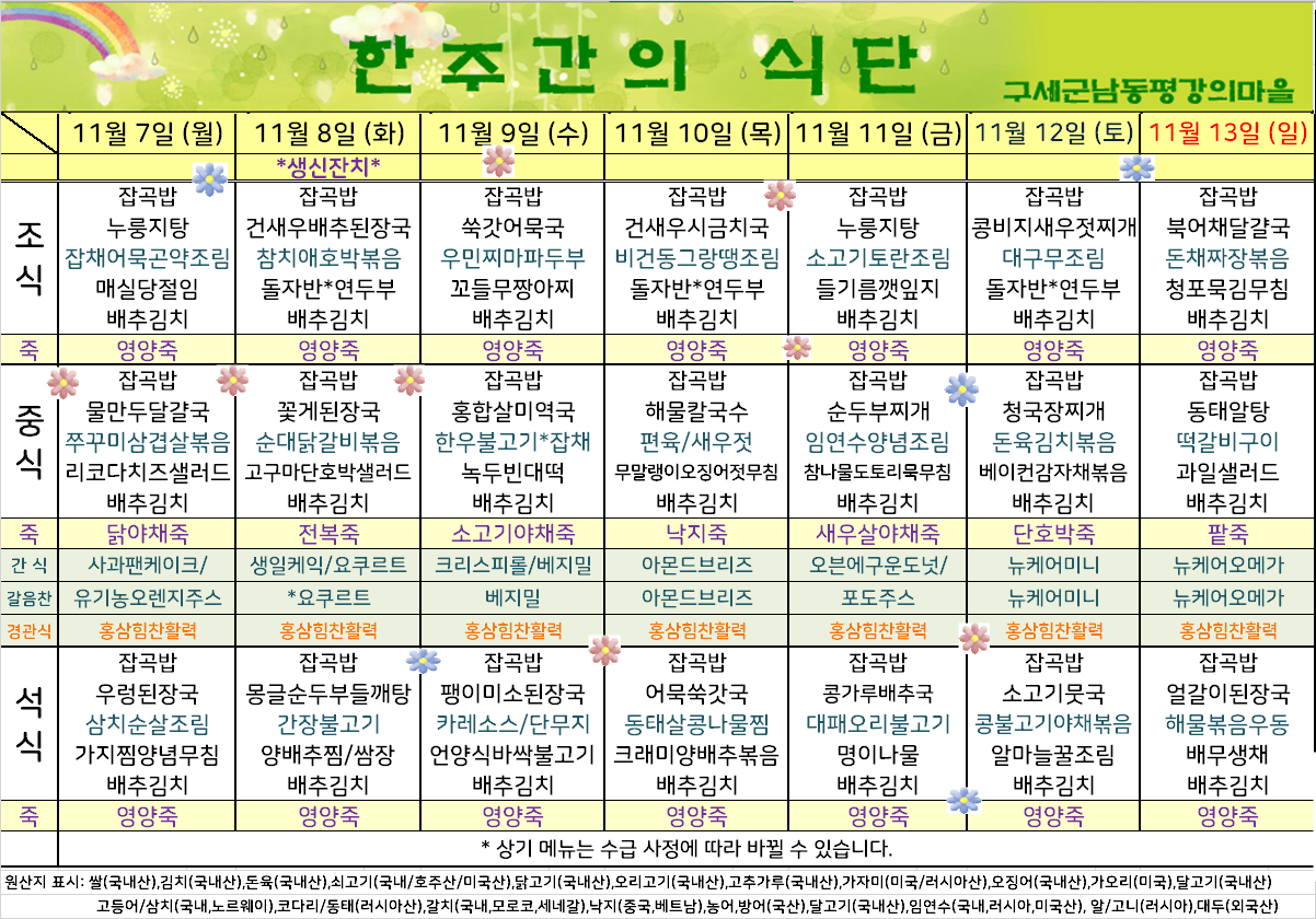 평강가족 > 자유게시판 > 11월 둘째주 식단입니다.
