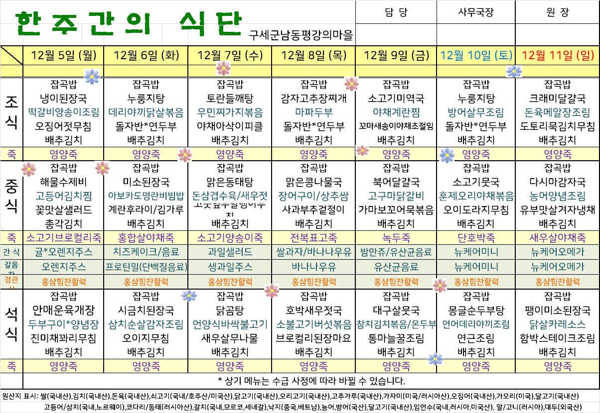 평강가족 > 자유게시판 > 12월 첫째주 식단입니다.