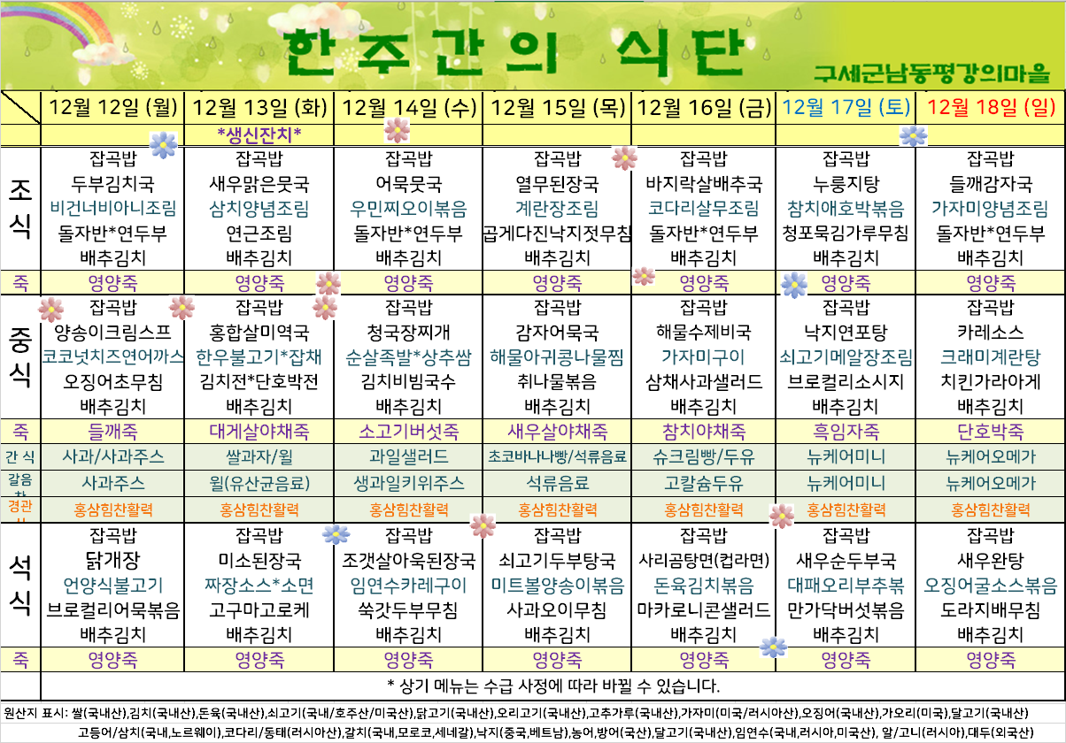 평강가족 > 자유게시판 > 12월 둘째주 식단입니다.