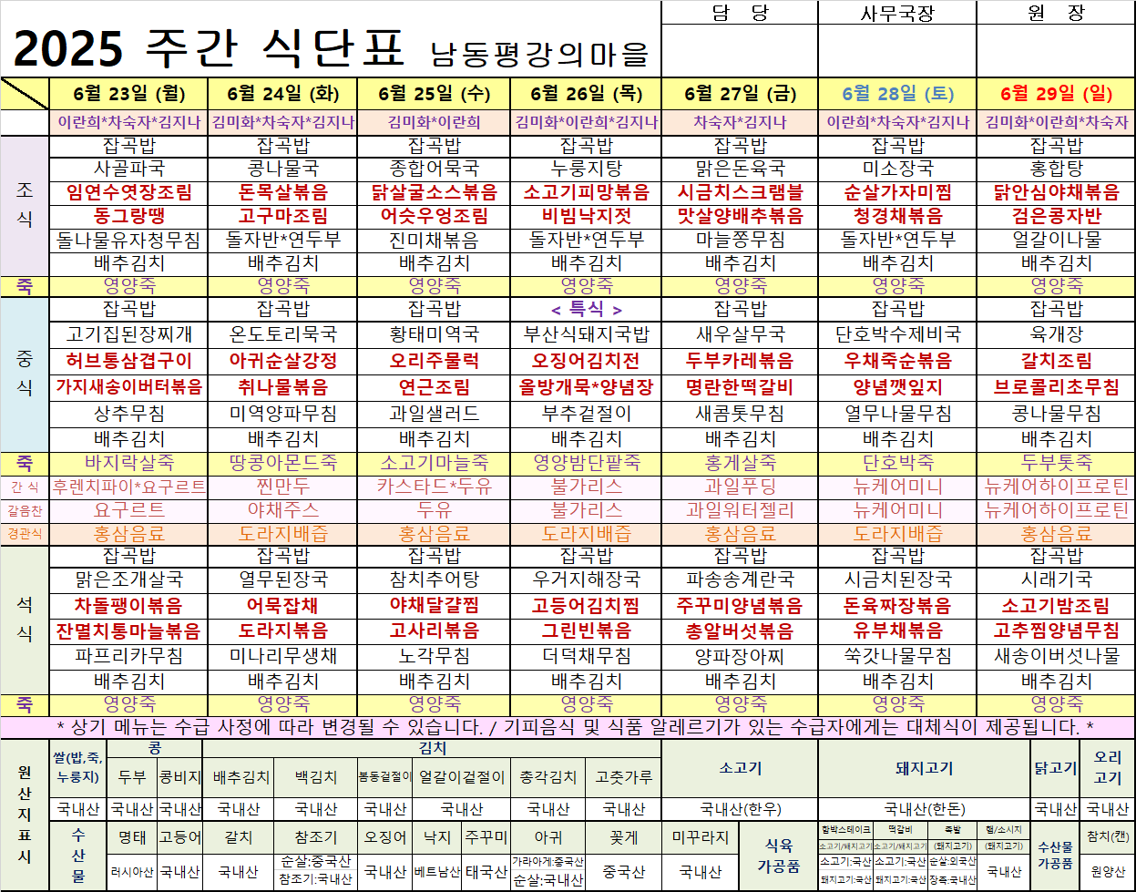 평강가족 > 자유게시판 > 6월 넷째주 식단입니다.