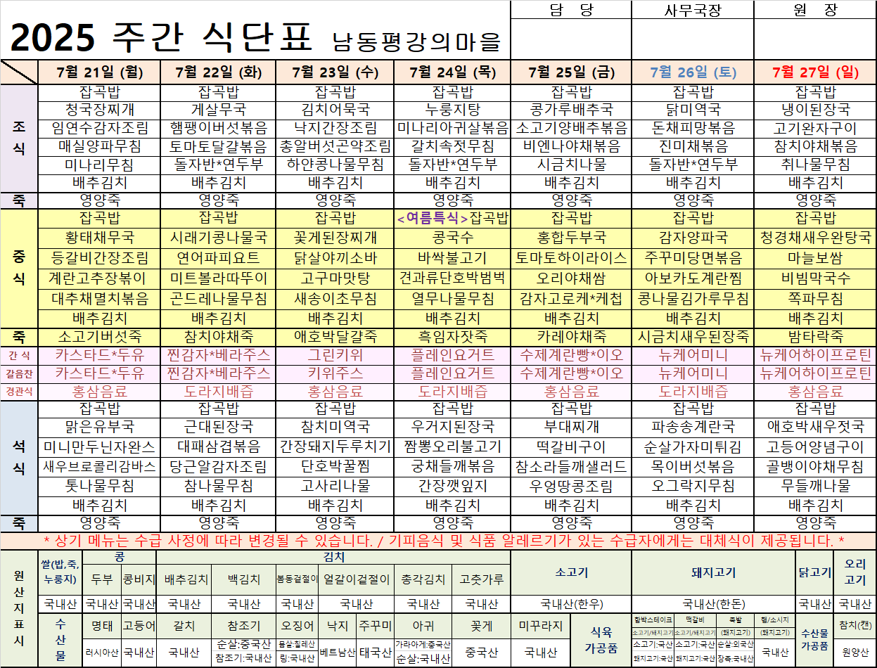 평강가족 > 자유게시판 > 7월 넷째주 식단입니다.
