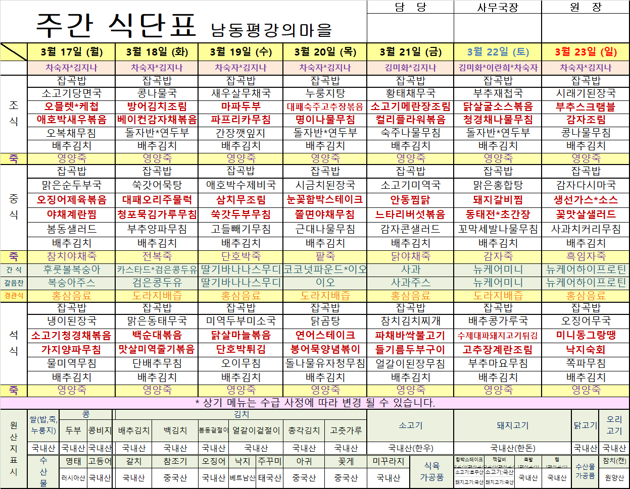 평강가족 > 자유게시판 > 3월 셋째주 식단입니다.