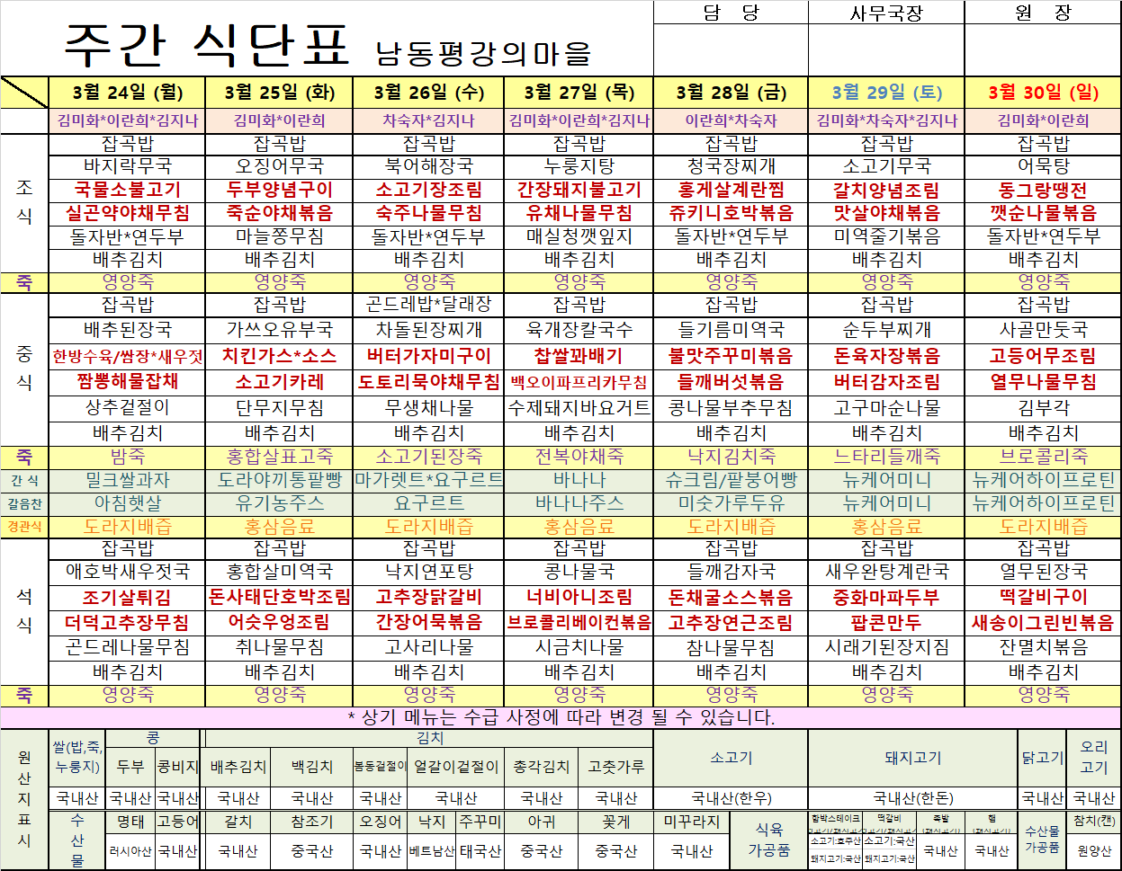 평강가족 > 자유게시판 > 3월 넷째주 식단입니다.