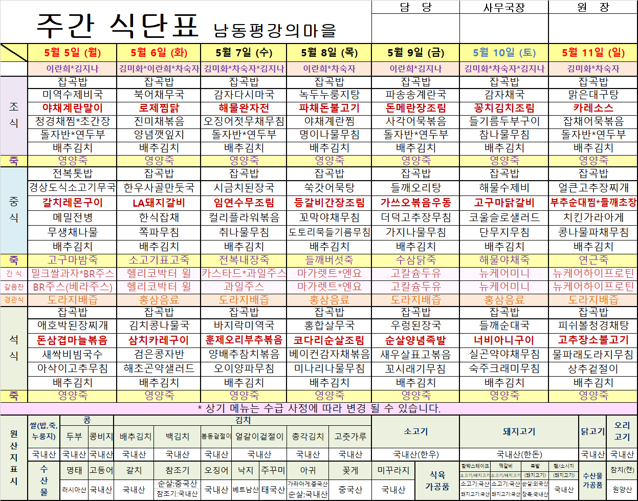 평강가족 > 자유게시판 > 5월 둘째주 식단입니다.