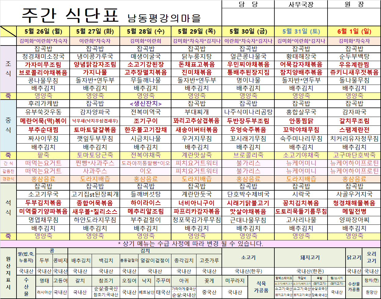 평강가족 > 자유게시판 > 5월 마지막주 식단입니다.