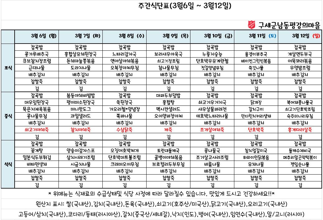 평강가족 > 자유게시판 > 3월 2째주 식단표 입니다.