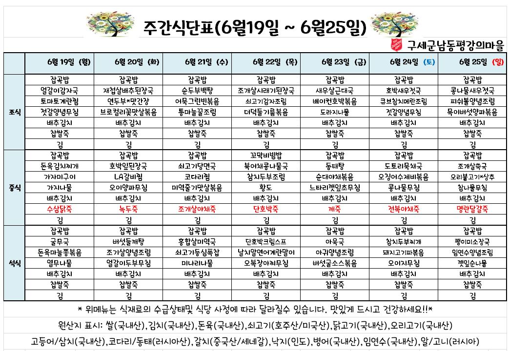 6월 4째주 식단표 입니다.