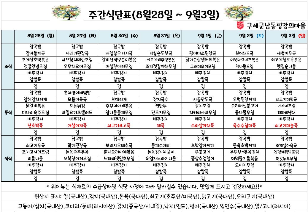 평강가족 > 자유게시판 > 8월 5째주 식단표 입니다.