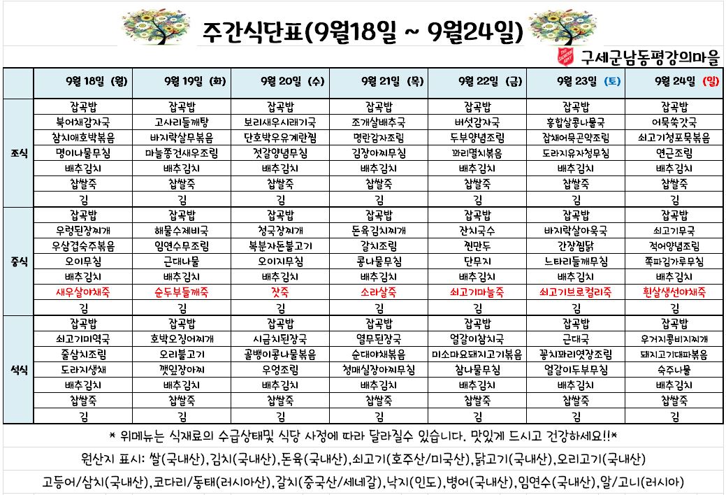 평강가족 > 자유게시판 > 9월 4째주 식단표 입니다.